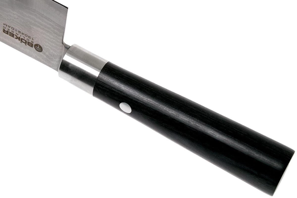 Este cuchillo de chef Böker Damast Black es, con una longitud de hoja de 21 cm, un cuchillo de chef de tamaño estándar. Como corresponde a un cuchillo de chef, es un auténtico comodín. Ya sea que desees cortar carne, pescado o verduras: todo será pan comido con este cuchillo.