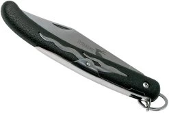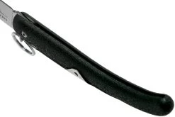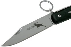 La Cold Steel Kudu 20KK es una extraordinaria navaja, con fuertes raíces sudafricanas. Destaca el gran llavero sobre el pivote. Forma parte del llamado «cierre de anillo». Tirando del anillo se desbloquea la cerradura. Puede que te cueste acostumbrarte al principio, pero cuando lo hagas, será pan comido. Hemos observado que la siguiente técnica es la que mejor funciona: Coloca el dedo índice en el anillo, el pulgar en la hoja y utiliza los dedos corazón y anular para apoyarte en el lomo del mango. Tira del dedo índice y el cuchillo se desbloqueará.