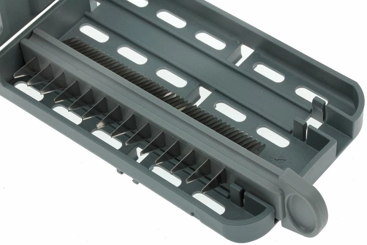 Esta hoja juliana de doble cara te permite hacer fácilmente tiras de tu pepino, o espaguetis de tu calabacín. La hoja doble tiene un lado con un grosor de corte de 2 mm y un lado con un grosor de corte de 7 mm. La hoja es adecuada para las mandolinas DeBuyer Swing y viene con un estuche de almacenamiento.