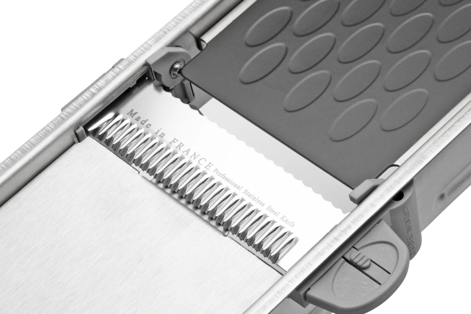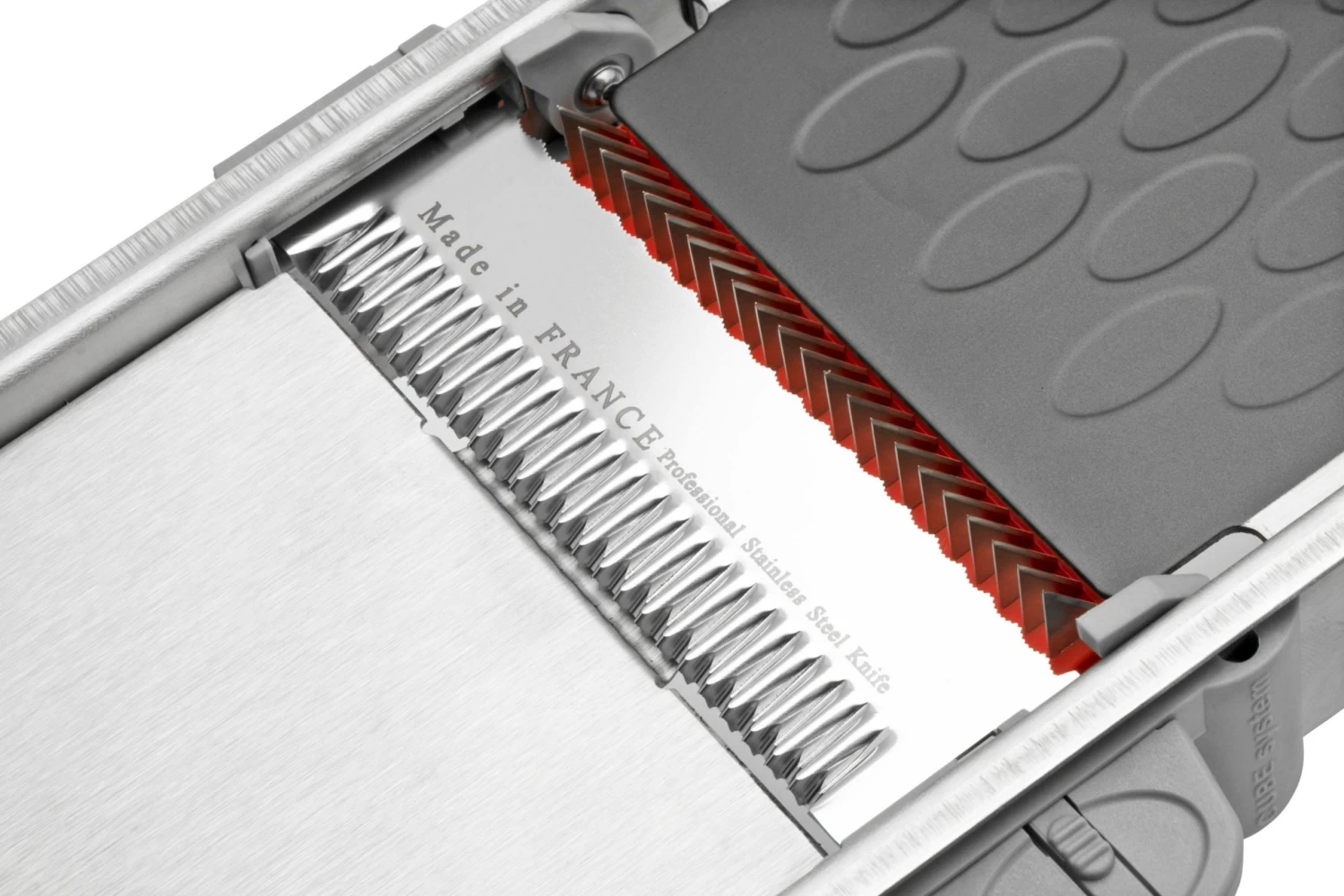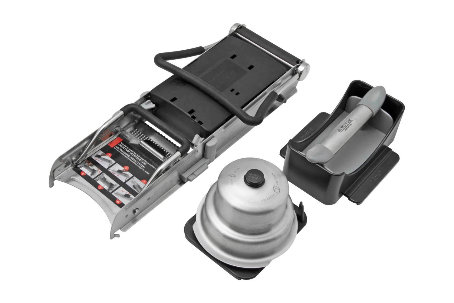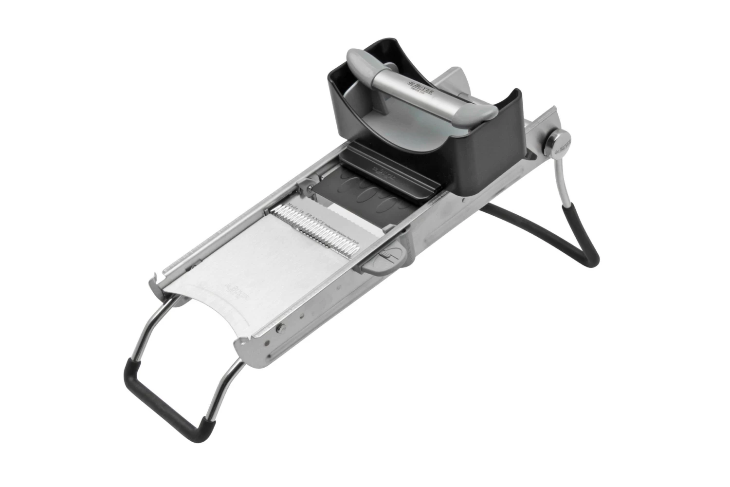 La mandolina de Buyer Ultra Revolution es resistente, robusta y versátil. El marco de acero inoxidable es extremadamente resistente y fácil de limpiar. Rodajas, gofres, cubos, tiras o diamante: esta mandolina puede hacerlo todo. Por supuesto, puedes ajustar fácilmente el grosor de corte de 0 a 10 mm. La única limitación está en tu imaginación.
