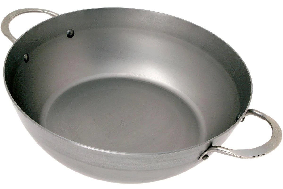 Esta olla Country Mineral B Element de Buyer de 32 cm es una sartén especial a un precio muy razonable. Está hecha de acero al carbono. Este tipo de acero no es inoxidable. Eso puede parecer un inconveniente, pero puede convertirse en una ventaja si se utiliza con cuidado. La sartén es sólida y pesada. No tiene revestimiento antiadherente, pero se formará uno automáticamente al utilizar la sartén. Debido a que las sartenes no tienen un revestimiento antiadherente, pueden cocinar a temperaturas muy altas. Además, puedes utilizar utensilios de cocina de acero sin preocuparte de dañar el revestimiento antiadherente. Los dos mangos de acero inoxidable proporcionan un buen agarre. Estas sartenes Mineral B Element tienen una fina capa de cera de abeja en la superficie de cocción en el momento de la entrega. Esto reduce significativamente la posibilidad de corrosión en el momento de la entrega. También ayuda a sazonar la sartén, y hace que la sartén sea ligeramente más antiadherente que la colección Acier Carbone normal, desde el principio. Es apta para todas las fuentes de calor, incluyendo la inducción y el uso del horno. Ten en cuenta que el mango de esta sartén se calienta mucho. Lava esta sartén sólo con agua caliente y un cepillo. El jabón está completamente descartado y el lavavajillas causará un daño irreparable a la sartén. Estas sartenes necesitan un tratamiento especial, pero cuando se usan correctamente, es un placer trabajar con ellas.