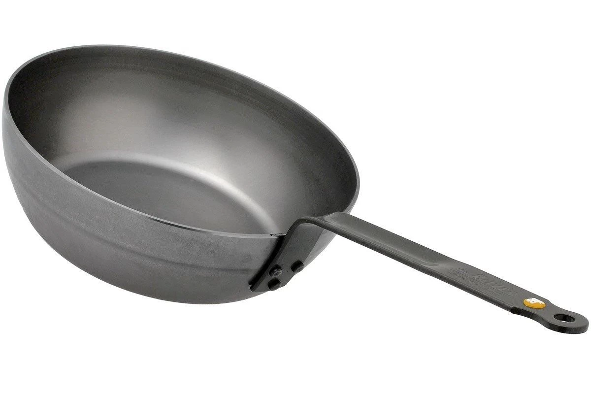 Esta sartén wok de Buyer Mineral B Element es una sartén especial que tiene un precio muy competitivo. Está hecha de acero al carbono. Un tipo de acero que no es inoxidable. Eso puede parecer un inconveniente, pero puede funcionar como una ventaja si se utiliza con cuidado. La sartén es sólida y pesada. No tiene revestimiento antiadherente, pero se formará uno automáticamente al utilizar la sartén. Debido a que las sartenes no tienen un revestimiento antiadherente, pueden cocinar a temperaturas muy altas. Además, puedes utilizar utensilios de cocina de acero sin preocuparte de dañar el revestimiento antiadherente. Estas sartenes Mineral B Element tienen una fina capa de cera de abeja en la superficie de cocción en el momento de la entrega. Esto reduce significativamente la posibilidad de corrosión en el momento de la entrega. También ayuda a aromatizar la sartén, por lo que la sartén es ligeramente más antiadherente desde el principio, que la serie Acier Carbone normal. Se puede utilizar en todas las placas de cocción. Incluyendo la inducción, e incluso se puede utilizar en el horno. Ten en cuenta que el mango de esta sartén se calienta. Lava esta sartén sólo con agua caliente y un cepillo. El jabón está completamente descartado y el lavavajillas causará un daño irreparable a la sartén. Estas sartenes necesitan un tratamiento especial, pero cuando se usan correctamente, es un placer trabajar con ellas.