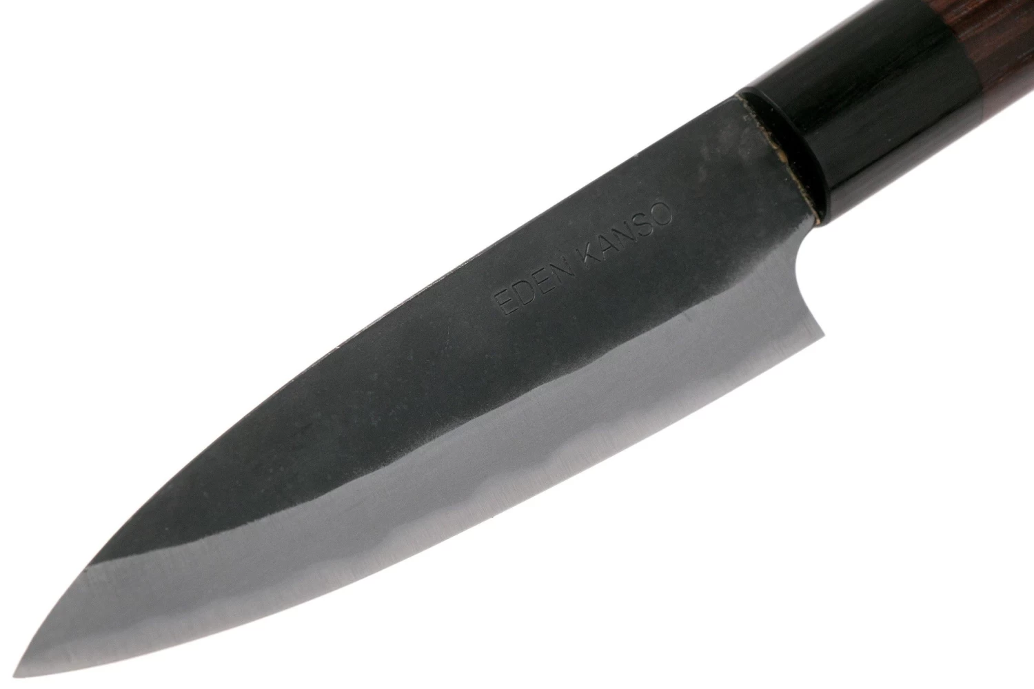 El cuchillo utilitario Eden Kanso Aogami es un auténtico todoterreno. El cuchillo tiene una hoja delgada y larga y puede utilizarse para una amplia gama de tareas de corte. La hoja es curva y termina en punta. Esto te permite balancear el cuchillo para picar los alimentos. La punta se utiliza para las tareas de corte preciso. Para cualquier tarea en la cocina en la que un cuchillo de chef es demasiado grande, puedes utilizar este cuchillo. Ya sea para cortar queso, salchichas o picar finamente hierbas.
