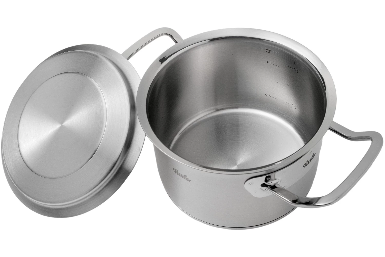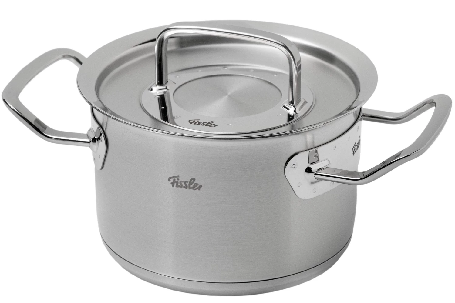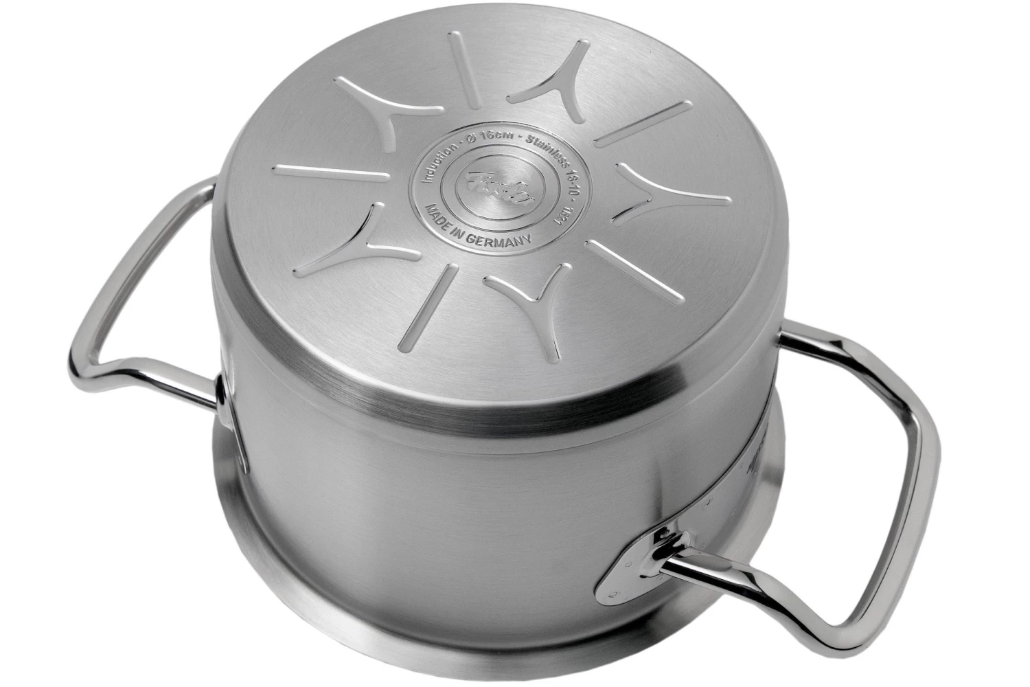 Esta olla original de la colección Profi de Fissler tiene un diámetro de 16 cm y un contenido de 2,1 litros. La capacidad interior es de 1,5 litros. La olla viene con una tapa.