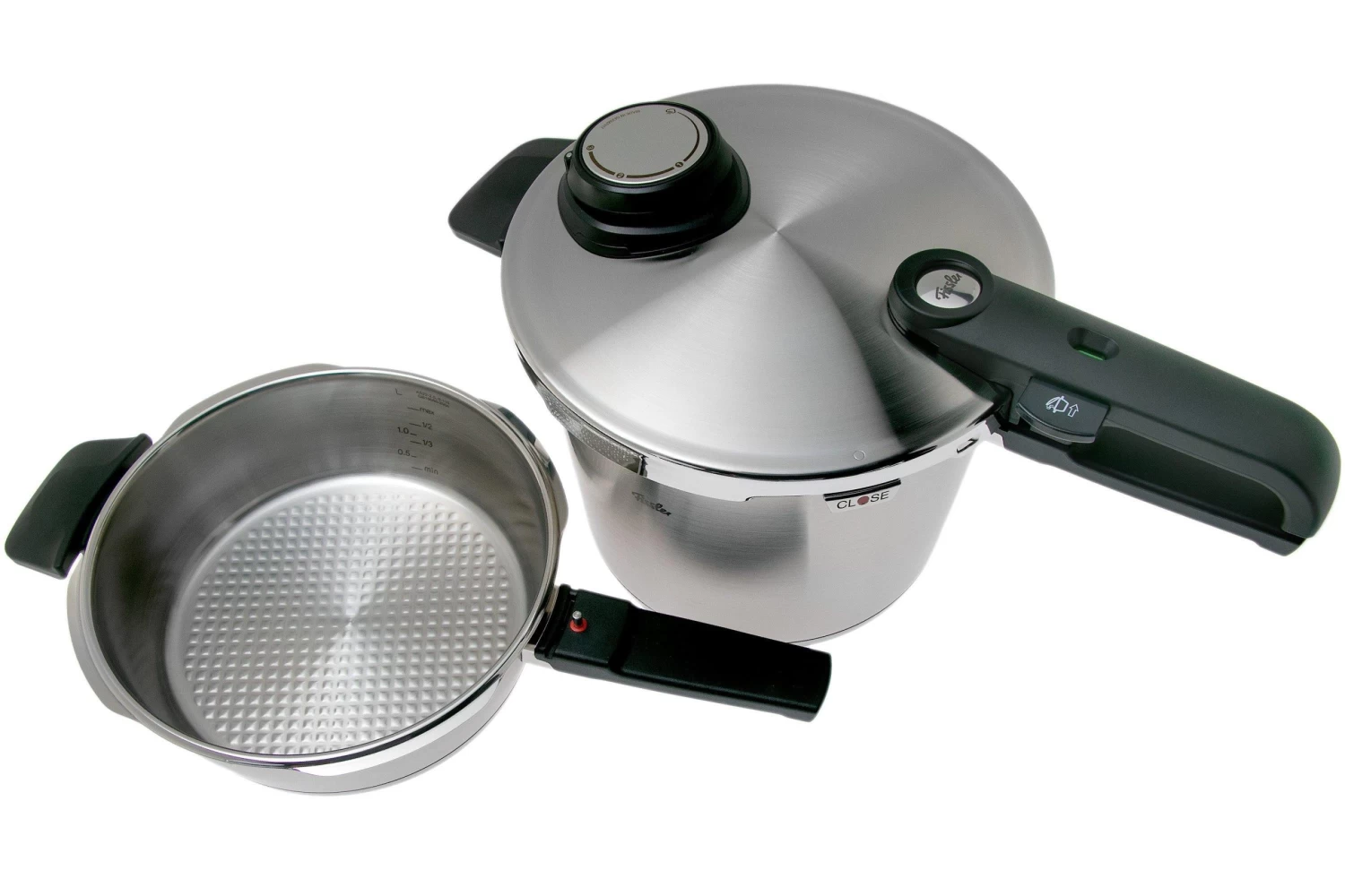 Este Juego de olla a presión de 3 piezas Fissler Vitafit Premium se compone de dos ollas a presión de las cuales una viene con un inserto de vapor. El tamaño de las sartenes es de 22 cm. El contenido de la primera olla a presión es de 6,0 litros y el de la segunda de 2,5 litros.