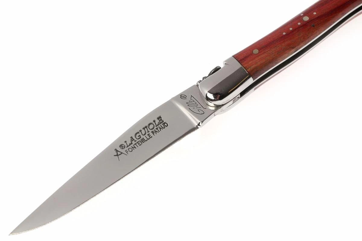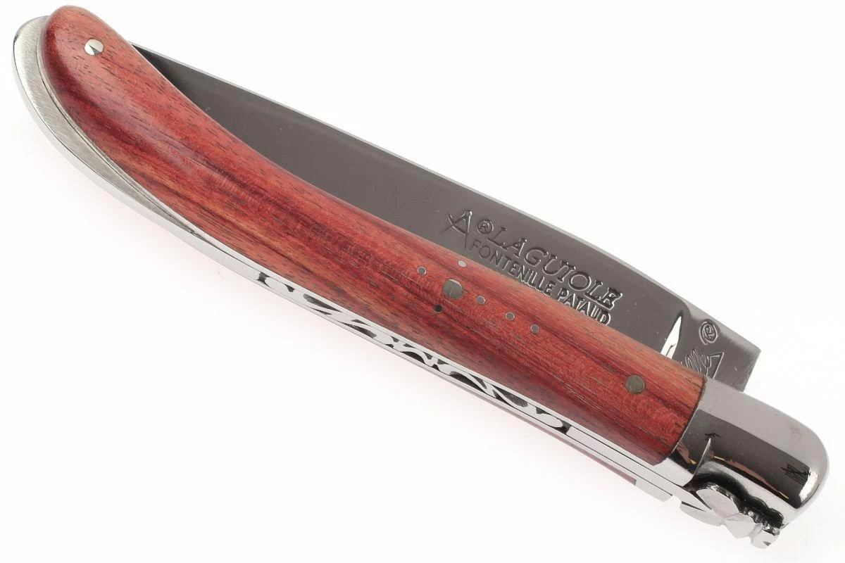 Navaja clásica francesa hecha a mano de Laguiole. Longitud cerrada: 9 cm. Realizada con una hoja de acero 14C28N pulido, realzada con un candado. Mango con cachas de palisandro.
