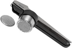 Con la prensa para patatas GEFU Force One podrás hacer fácilmente puré de patatas. Pon la patata dentro y aprieta todo el cierre. Gracias al mecanismo de palanca, esto no supondrá ningún esfuerzo. El mango curvado refuerza la palanca y se siente perfecto en la mano. Además del puré de patatas, también puedes utilizar esta prensa para hacer batidos.