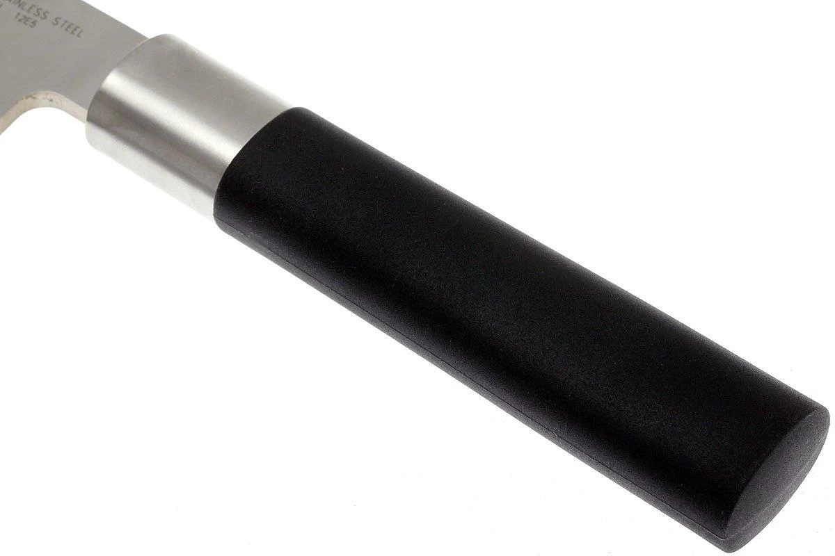 Kai es conocida por sus cuchillos de cocina Kai Shun de alta calidad. La colección Kai Wasabi también es de gran calidad, pero es un poco más asequible. La hoja de acero inoxidable Daido 1K6 está afilada con una dureza de 58 HRC. Como estos cuchillos no tienen cabezal, se puede utilizar todo el filo y se puede afilar toda la longitud. El mango está hecho de una combinación de polvo de bambú y polipropileno. Esto lo hace duradero e impermeable.