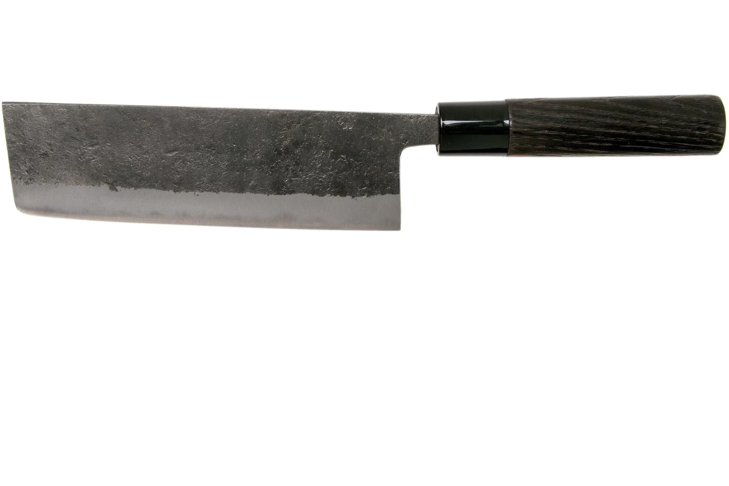 El Munetoshi Nashiji Black Nakiri 16,5 cm es un elegante y amplio cuchillo de cocina japonés. Un Nakiri es un cuchillo tradicional japonés de verduras. En Japón, los cuchillos de verduras se denominan Nakiri (afilado de doble cara) o Usuba (afilado de una sola cara). Un Nakiri se reconoce por su hoja rectangular con punta redondeada. Utiliza el cuchillo para cortar verduras grandes como zanahorias, calabacines y coles.
