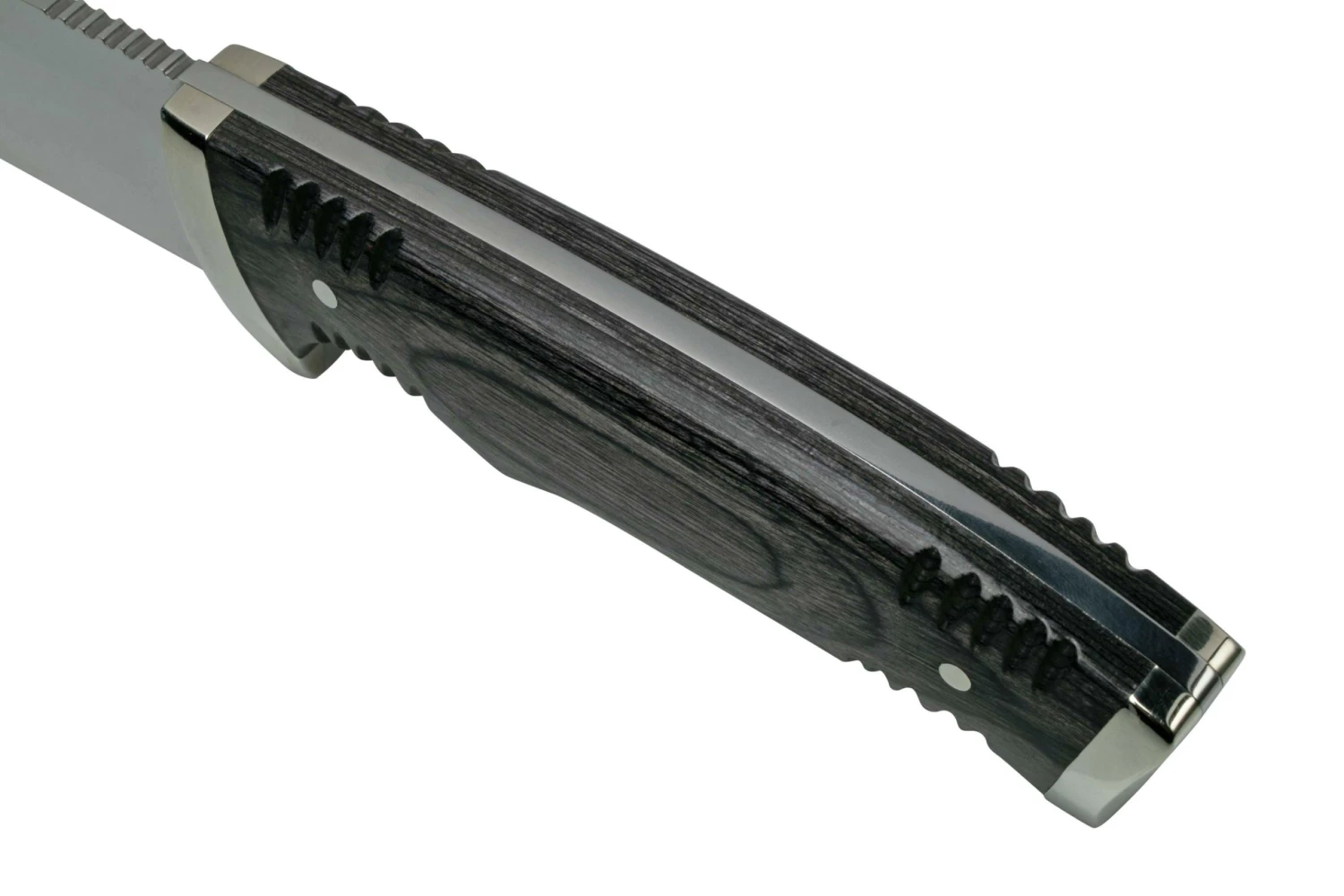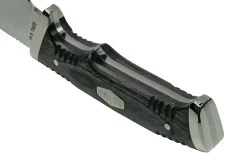 El Old Timer Fixed Blade 1135992 es un cuchillo de caza de gran tamaño con mango de madera laminada. A pesar del tamaño del cuchillo, las ranuras para los dedos en el mango lo hacen muy cómodo de sostener. La gran hoja de punta caída también tiene una ranura para los dedos. Realmente agradable para las tareas que requieren precisión. La hoja también tiene un reborde (jimping) en el lomo, que proporciona un agarre adicional al cortar.