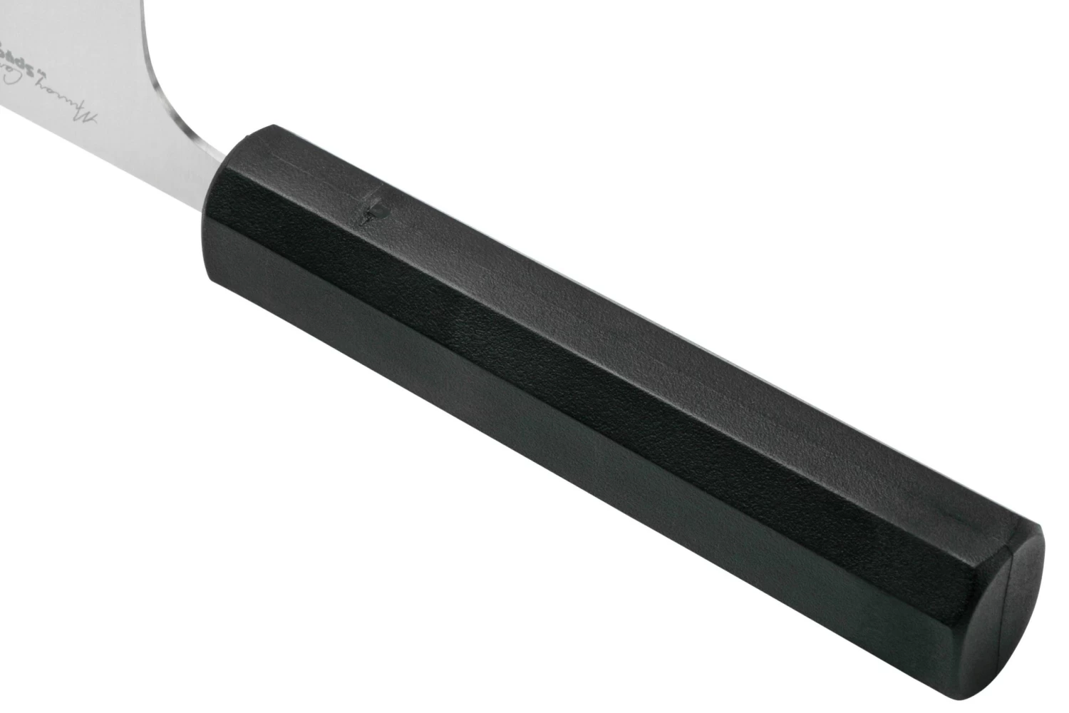El cuchillo Spyderco Nakiri de la colección Murray Carter Minarai es impresionante en toda su simplicidad. Nakiri significa «cortador de verduras». Su forma única y rectangular hace que este cuchillo sea perfecto para cortar todo tipo de verduras. La punta del cuchillo es ligeramente redondeada para que también puedas cortar rápidamente verduras en ángulo. Además, podrás cortar hierbas en porciones minúsculas con gran facilidad.