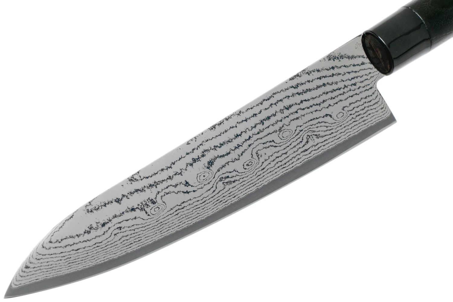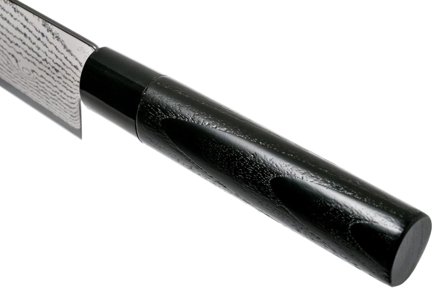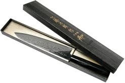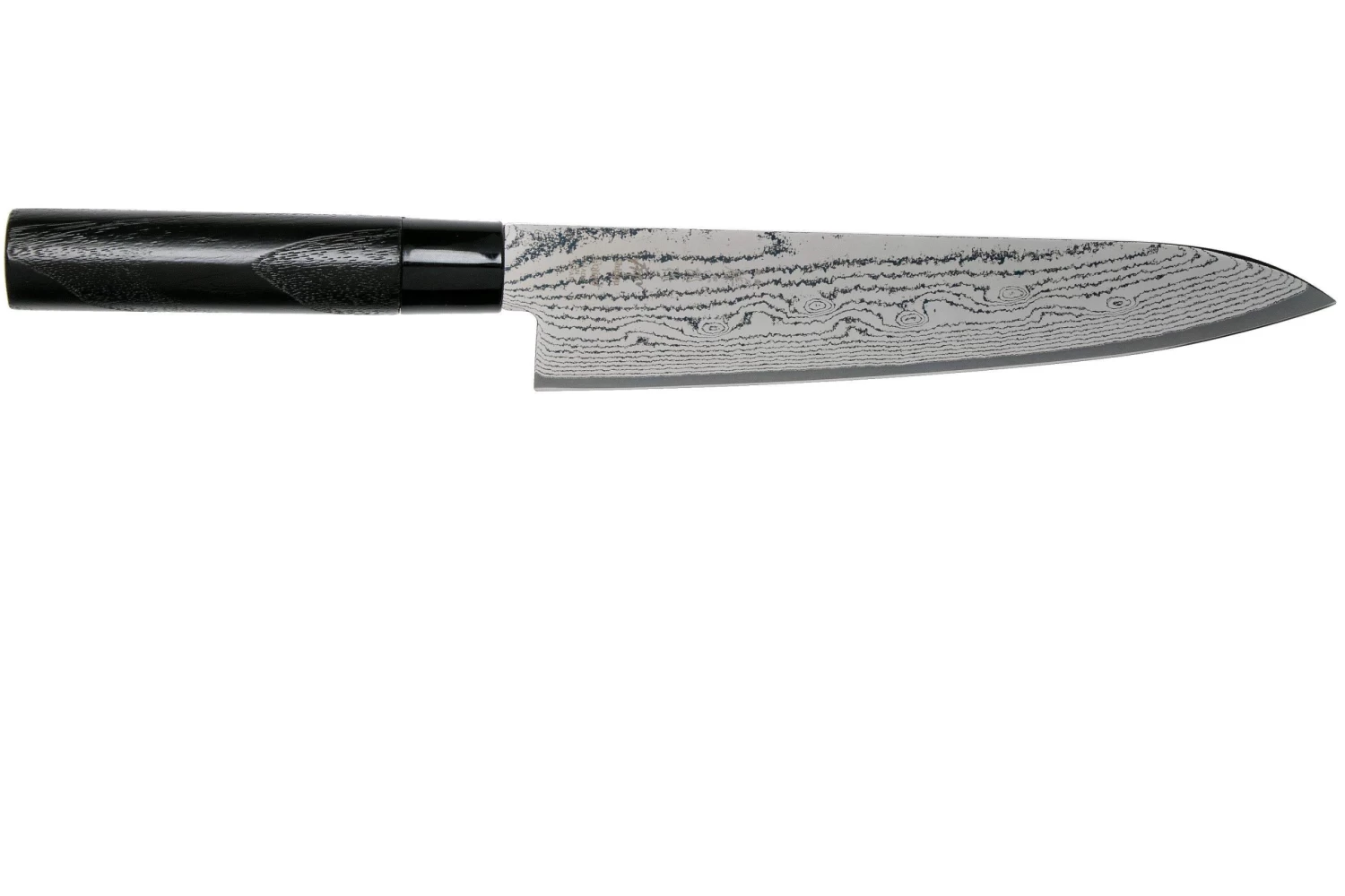 El cuchillo de chef Tojiro Shippu Black Damascus de 24 cm es el cuchillo de chef perfecto. La hoja de 24 cm de longitud es la más larga de la colección Shippu Black, por lo que dominará todos los ingredientes en la cocina. Incluso los trozos más grandes de verdura o carne son fáciles de cortar con un solo movimiento.