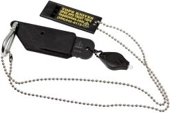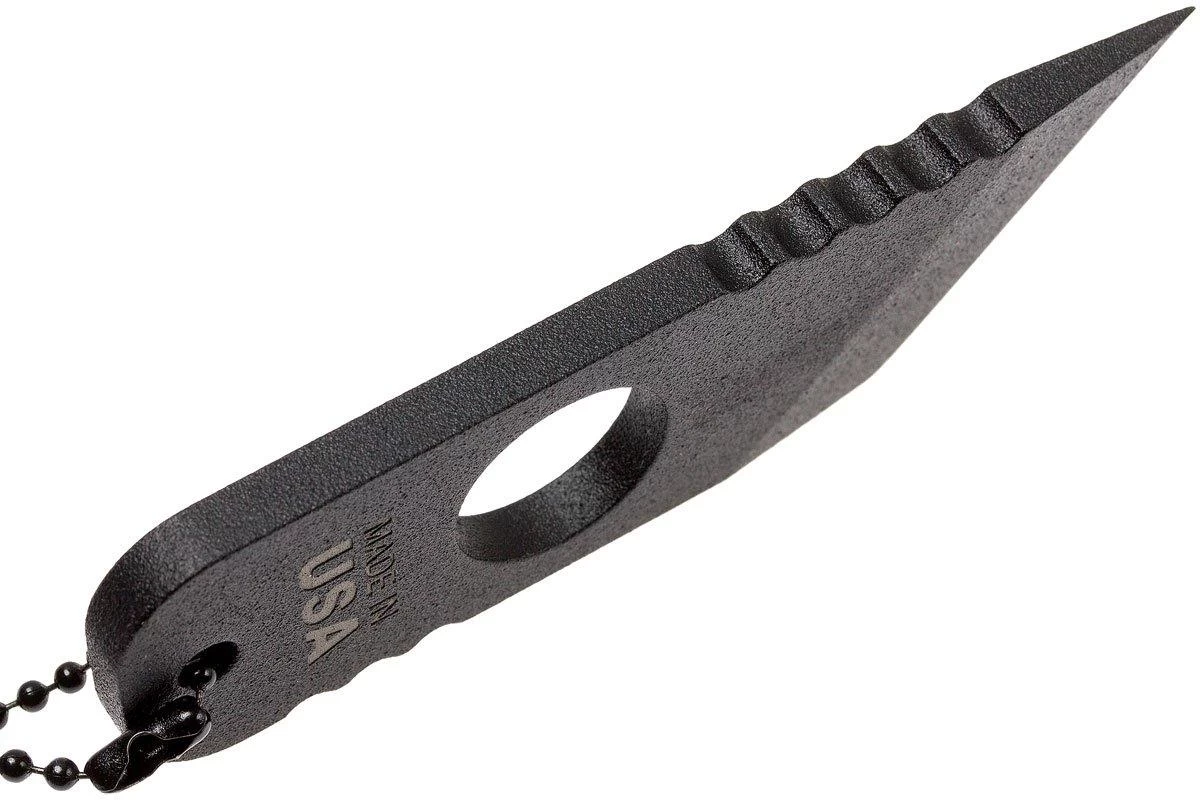 El TOPS ALRT-01 es un pequeño cuchillo de cuello diseñado para emergencias. Se podría decir que los cuchillos no son más sencillos que esto: una hoja de acero con un filo afilado. Sin embargo, si se mira un poco más de cerca, se verá que este cuchillo ha sido bien pensado. Las estrías de agarre, también conocidas como jimping, se han aplicado en todos los lugares adecuados. Se ha perforado un agujero en el centro del mango. En parte para ahorrar peso, pero también para poder pasar un dedo por él, lo que permite un excelente agarre de este pequeño cuchillo.