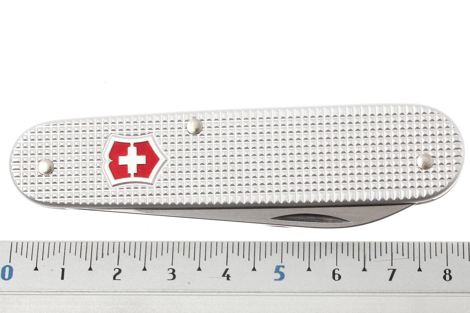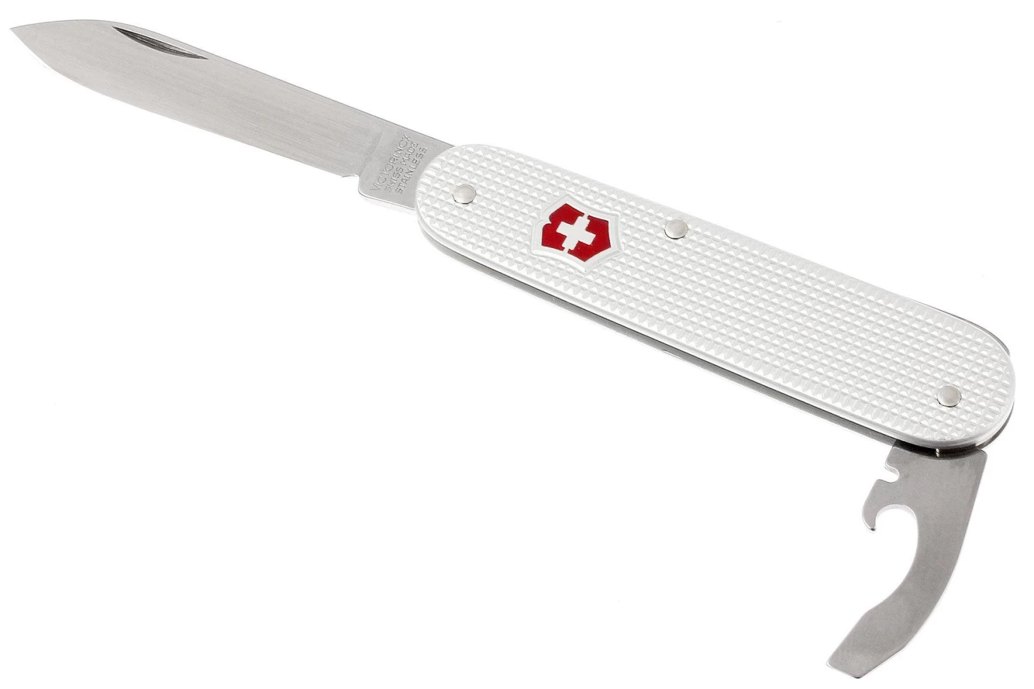 Navaja Victorinox con cachas de alox estriadas (aluminio). Muchas son más ligeras y finas que los cuchillos estándar. Dos piezas plegables con cinco funciones.