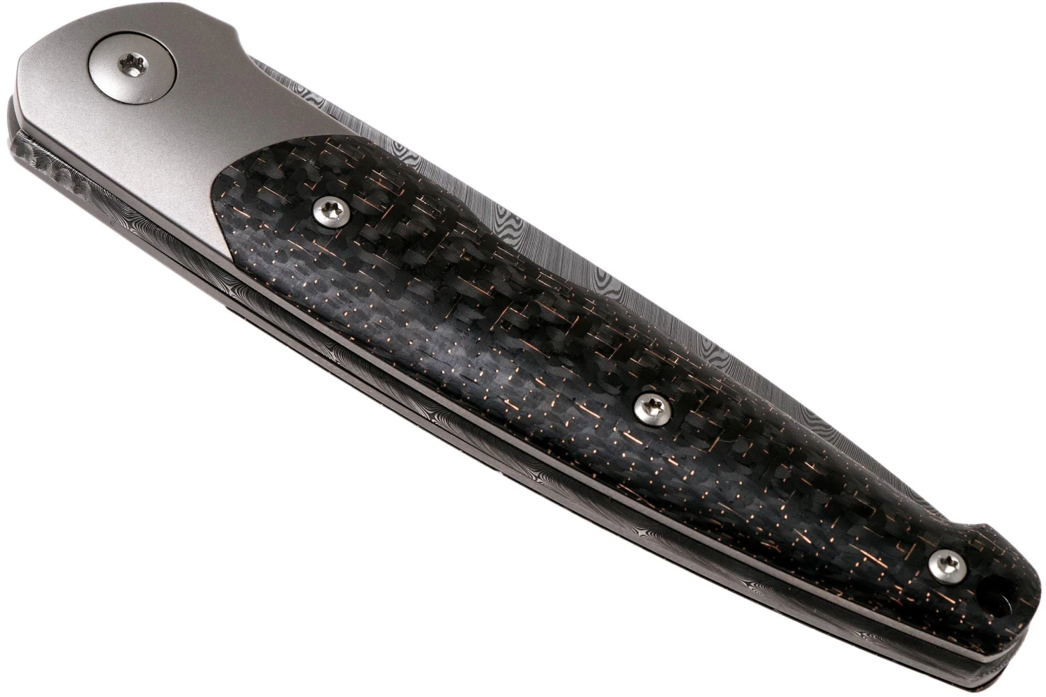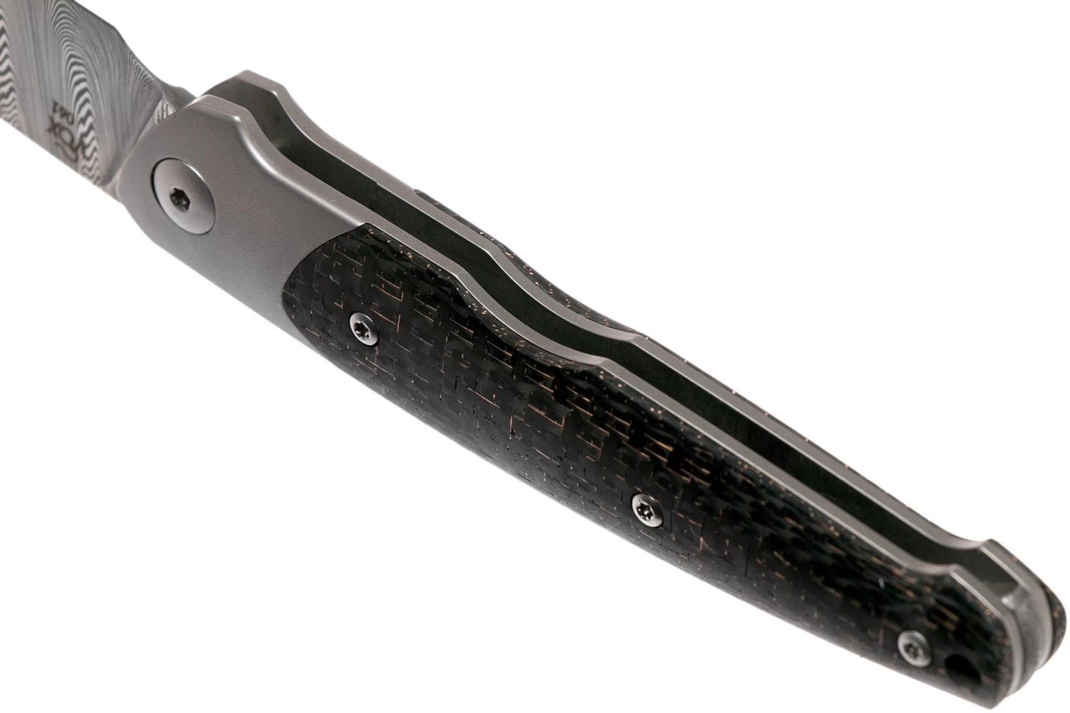La navaja Viper Key VA5978FCB Bolster Copper de fibra de carbono es una elegante navaja de caballero, diseñada por Jesper Voxnaes. Se ve claramente su estilo de diseño típico y único en este destacado cuchillo de caballero. No hay una línea clara a la vista. Todas las formas, líneas y detalles están en sintonía, creando un conjunto armonioso. Su delgado diseño es atractivo y lo convierte en un cuchillo de caballero perfecto para quien le guste llevar un traje elegante.