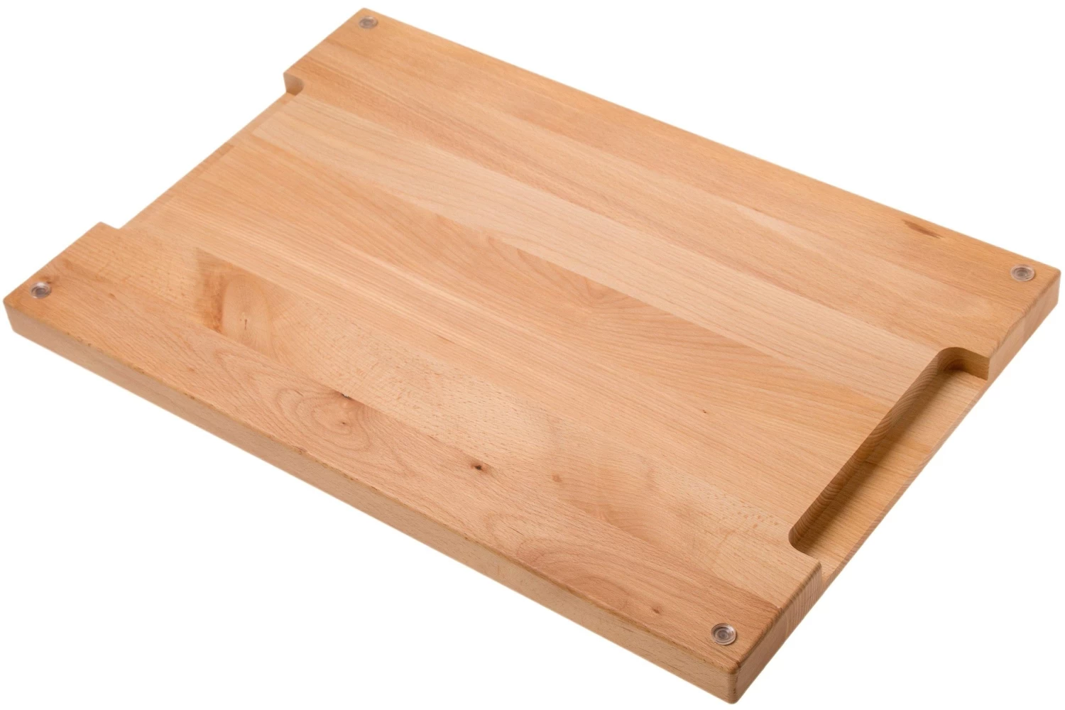 Esta tabla de cortar de haya Zwilling es una tabla de cortar muy grande. Cuanto más grande sea la tabla de cortar, mejor será su uso. Ya que tendrás más espacio para el corte y para poner las verduras o la carne recién cortada apartadas mientras estás cortando más. La tabla de cortar tiene cuatro pequeños pies transparentes en la parte inferior. Estos garantizan que la tabla no se desplace durante el corte. Los pies también evitan los arañazos en la encimera.